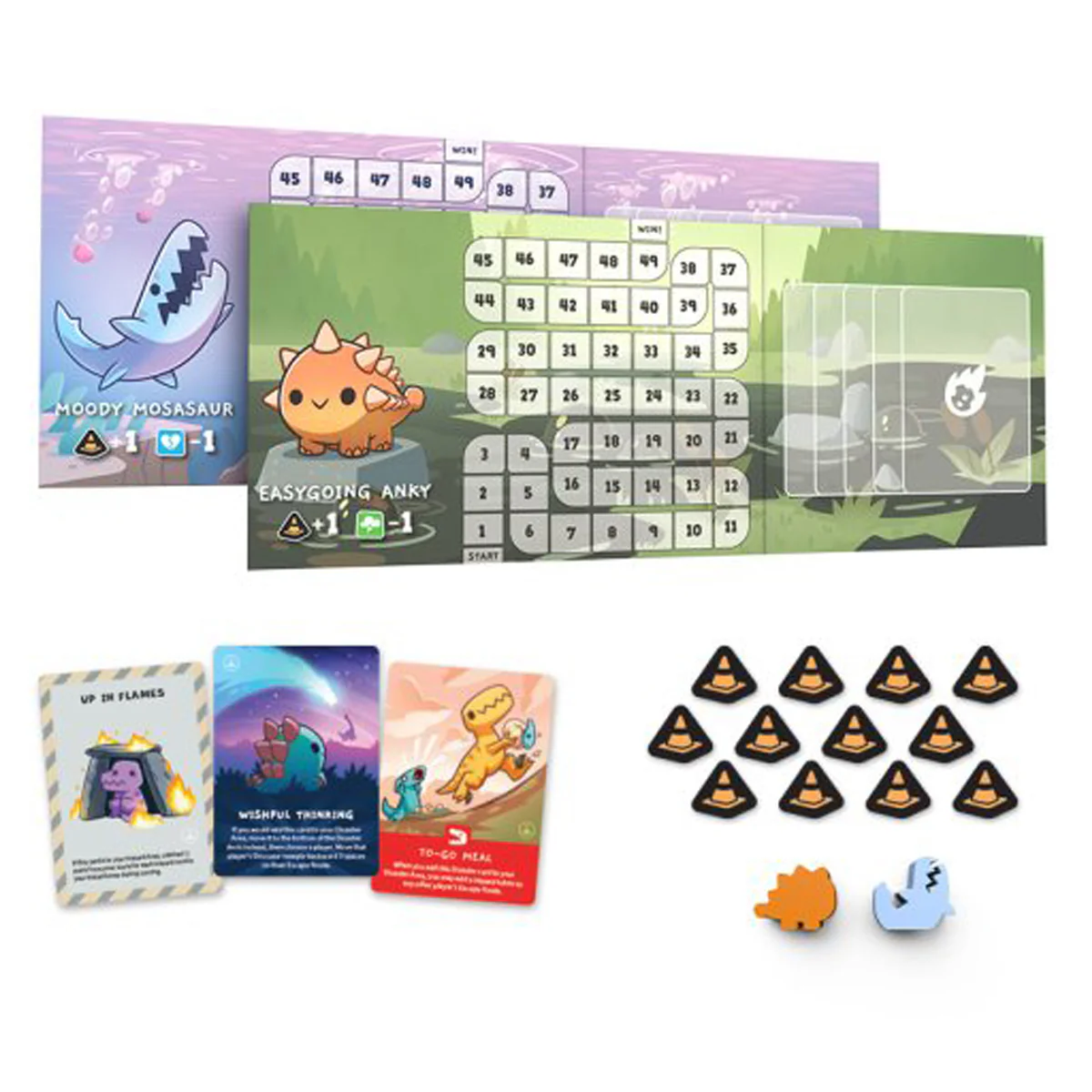 Grab your hard hat there are hazards ahead! This Happy Little Dinosaurs Expansion Pack comes with 2 new characters and 3 new game components. Hazard tokens can force your opponents to take a Hazard card and face new misfortunes, while Lucky Day cards will help you dodge disasters. You might come face-to-face with Bigfoot or get sucked into a pyramid scheme, so let's hope a shooting star is just around the corner!